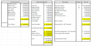 From Jeff’s Lead Post == The CBT threshold is $233MM. Currently the Dodgers are sitting at $184,786,666. That includes Clayton Kershaw but not Trevor Bauer…. They are currently $48,213,334 under the threshold.