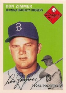 1955 would be a magical year for the Dodgers and Zimmer. He had a great spring and Alston asked him if he could play second base. Zim told the skipper he could, even though he had never played there. His little white lie paid off and he became the Dodgers top utility player getting into 88 games and showing a .239/15/50 line for the year. Brooklyn won the pennant, and were off to the World Series against the Yankees.